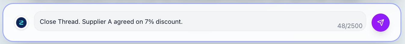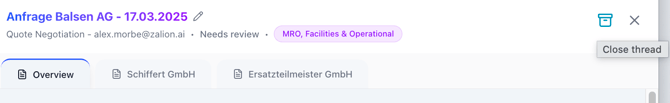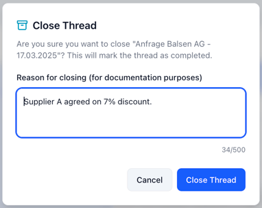 Schließen Sie jeden Vorgang ab – auch wenn kein Nachlass erzielt wurde. Gerade diese Vorgänge sind besonders wertvoll: Der Angebotsverhandlungs Agent lernt daraus, welche Hebel bei welchem Lieferanten weniger wirksam sind, und passt seine Empfehlungen für zukünftige Verhandlungen entsprechend an.