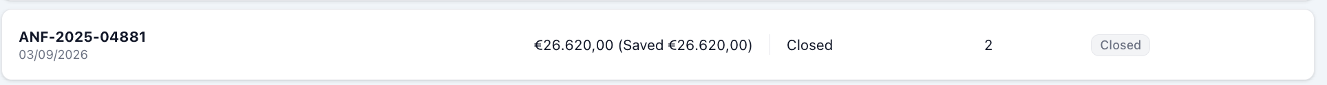 Das Abschließen eines Vorgangs geht auf zwei Wegen: direkt über die Chatfunktion oder über das Box-Icon oben in der Vorgangsansicht. Schließen Sie jeden Vorgang ab – ob mit oder ohne Nachlass. Nach dem Abschluss wechselt der Status auf „Closed" und die Realized Savings werden in Ihrer Übersicht sichtbar.